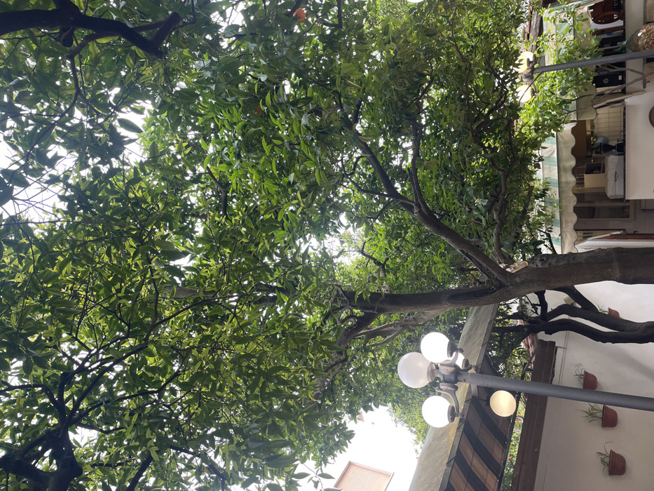 The image displays an outdoor area, likely a garden or courtyard, within Sorrento, Italy. A dense canopy of green foliage from large trees, consistent with citrus trees, dominates the upper two-thirds of the frame, with several small orange fruits visible among the leaves, primarily in the upper right quadrant. In the lower-left, a dark grey pole-mounted lamp stands, featuring three spherical white globes at its apex and a single hanging translucent spherical light below. Behind this lamp, a dark, angled roof or awning partially covers a structure, with a section of a light-colored building wall and a reddish-brown window shutter visible in the far upper-left. Below the awning, a white wall supports three terracotta-colored pots, each containing a small green plant. To the right, partially obscured by tree trunks and branches, is a building with a cream and white striped awning retracted, revealing what appears to be an outdoor service area with a white appliance and dark countertop visible. A second, partially obscured lamp and a dark, decorative pineapple-shaped object are present in the lower-right corner. No individuals are visible in the scene.