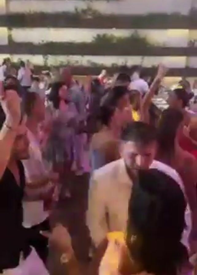 crowded gathering of people dancing and moving in a room. The lighting shifts between yellow, blue, and purple, adding to the lively atmosphere. The crowd is dense, with people close together. The background shows what appears to be a wall decorated with greenery, possibly a restaurant or event space. There's a clear sense of celebration or party, with people raising their hands and dancing energetically.
