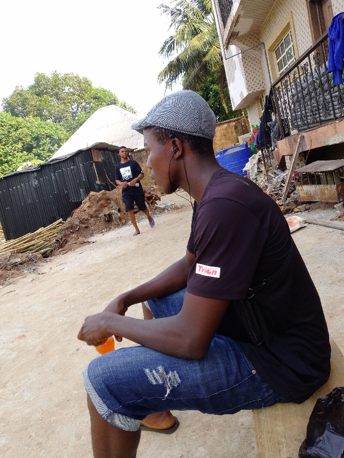 An outdoor scene in Alor, Nigeria, depicts two males in an unpaved residential or semi-rural area. In the foreground, a dark-skinned male is seated, facing left, wearing a grey plaid flat cap, a black t-shirt with a "Trion" logo on the left sleeve, ripped blue denim shorts, and brown sandals. He has black wired earphones in both ears and holds a small orange bottle in his right hand. A black plastic bag rests on the ground beside him. In the background, a second dark-skinned male stands to the left of center, facing partially right, wearing a black t-shirt with a white graphic (possibly "Coco"), black shorts, and light-colored flip-flops, holding a light object in his left hand. The environment includes a low structure on the left made of black corrugated metal with a white corrugated roof, behind which are piles of earth/rubble and a stack of bamboo-like poles. Dense green foliage and trees are visible beyond. On the right, a two-story building with a patterned light-colored facade features a dark metal balcony railing from which blue fabric hangs. A window is visible on the upper floor. Further right, a blue plastic barrel and additional debris are present. The ground is light brown dirt or sand. Palm trees are visible near the building on the right. The sky is bright and largely clear.