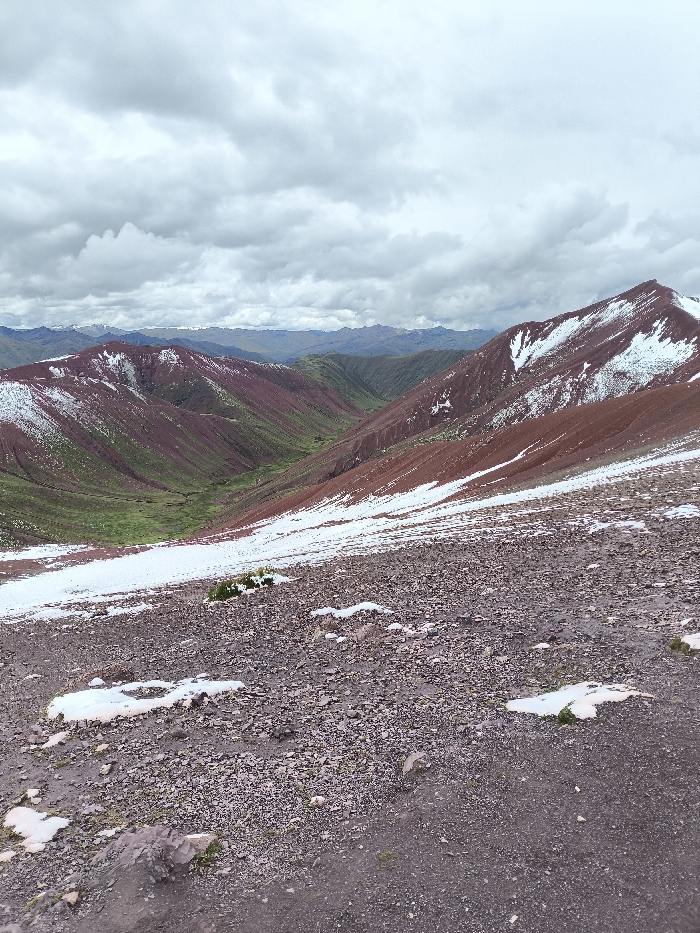 Mountains with streaks of red, green, and snow patches under an overcast sky dominate the scene. The foreground consists of rocky terrain with scattered snow. A valley cuts between the mountains, displaying vibrant green vegetation. Distant, snow-capped peaks are visible on the horizon. The cloudy sky diffuses the light, casting a soft glow over the landscape.