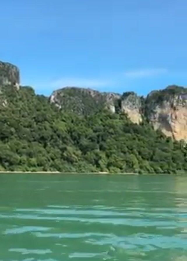 boat moving on turquoise water with a shoreline of limestone cliffs covered in lush green vegetation in the background. The sky is a clear, bright blue. The camera appears to be on the boat, as it moves along the water. The water has small, gentle ripples. The cliffs show various colors of stone, including white, gray, and tan, mixed in with the greenery.