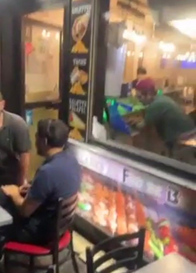 two men sitting at a table outside a food stall. The food stall has signs for Galettes, tacos, and other food items. Inside the food stall, a person is preparing food. The video then cuts to a man with curly hair and sunglasses standing in front of a door, holding a can. He looks at the camera and speaks.