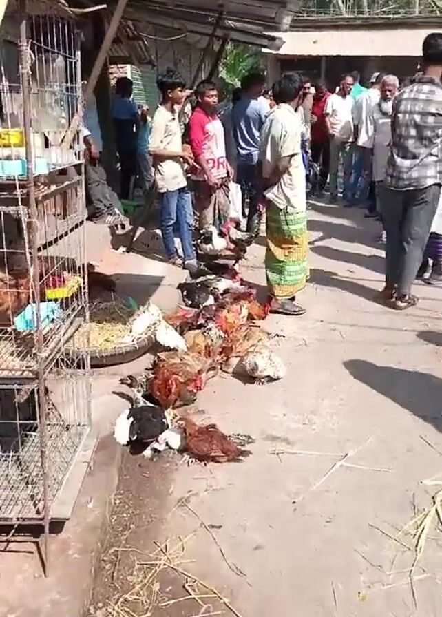 busy outdoor market scene. Several people are gathered, some looking at a group of live chickens and ducks on the ground. Some of the fowl are also in cages stacked along the side of the walkway. The environment appears to be rural, with simple buildings and lush vegetation visible in the background. People of various ages are present, dressed in casual clothing, some wearing traditional attire. The overall atmosphere suggests a typical market day in a village setting.