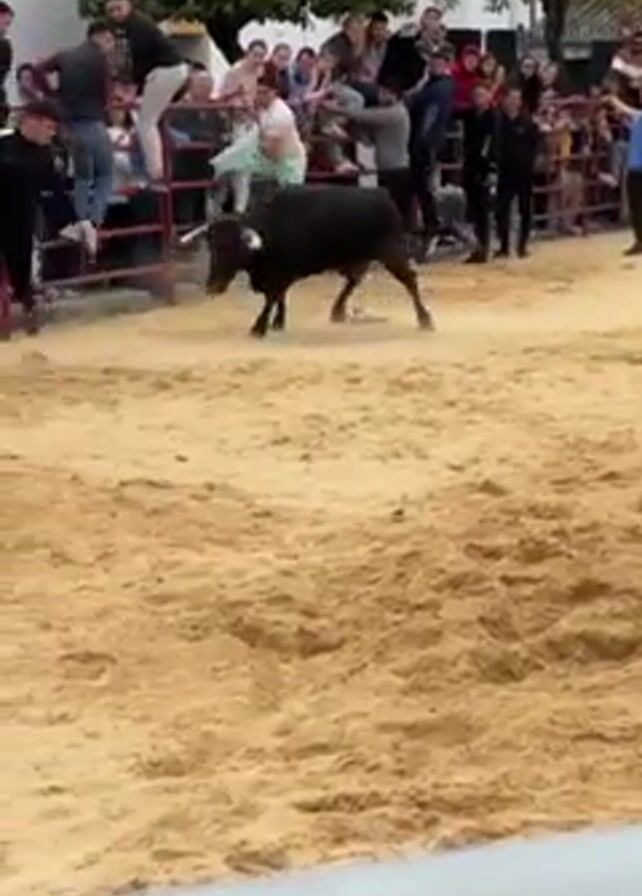 The video captures a bullfighting event in a sandy arena, bordered by red fencing and a large crowd of spectators