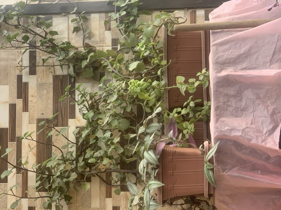 The image captures an outdoor scene in Ma'raba, Syria, focusing on a collection of plants. In the background, a wall is tiled with rectangular ceramic tiles arranged horizontally in alternating shades of light brown, beige, and dark brown. Multiple green plants are present, some appearing dusty. At least two brown plastic planters are visible in the midground. One square planter on the left contains a *Tradescantia zebrina* plant with variegated silver-green and purplish leaves, some trailing over the edge. Other plants with primarily green, somewhat dusty foliage vine and climb against the tiled wall, originating from these planters. The planters rest on a surface covered by a crinkled, light pink sheet or fabric. A vertical wooden rod is positioned on the right, partially visible behind the plants and adjacent to the draped surface. A small plant in a brown saucer sits on the pink draped surface in the lower left. No people are present.