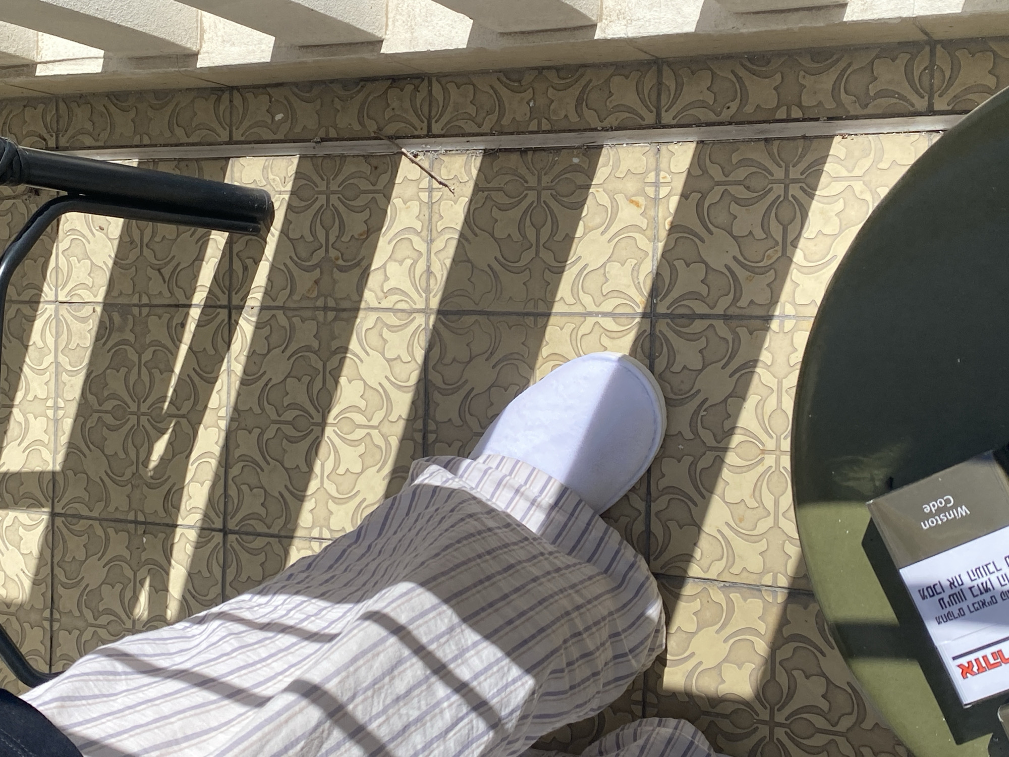 The scene is on a tiled balcony in Tel-Aviv, Israel. The tiles are patterned with a floral motif and cast in shadow. A white slipper is partially visible under striped pajama pants. To the left is the partial frame of a black chair. To the right, on a green table, is a pack of Winston Code cigarettes with Hebrew text.
