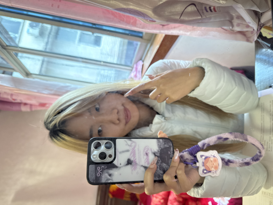 A young woman with blonde and black hair is taking a selfie in a mirror. She's wearing a white puffer jacket and holding a black iPhone with a distinctive case and a purple furry wrist strap with a cartoon charm. Her nails are long and manicured. The mirror reflects a window with buildings outside and a glimpse of the room's interior. She is making a peace sign with her left hand near her face.