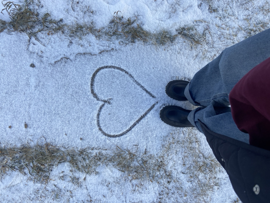 The image displays a top-down view of a person's lower body standing on snow-covered ground. A distinct heart shape is drawn into the snow, exposing the darker earth beneath, centered horizontally above the feet. The ground features a thin layer of white snow interspersed with visible patches of dried, light brown grass, particularly along two parallel, linear segments resembling a narrow path or tracks. The individual is wearing light-wash blue denim jeans, cuffed at the ankles, and dark, robust boots with thick, textured soles. A portion of a dark, possibly black, quilted outer garment is visible on the left, partially covering a reddish-brown or burgundy garment underneath. The scene is located in Aleksandrovka, Russia.