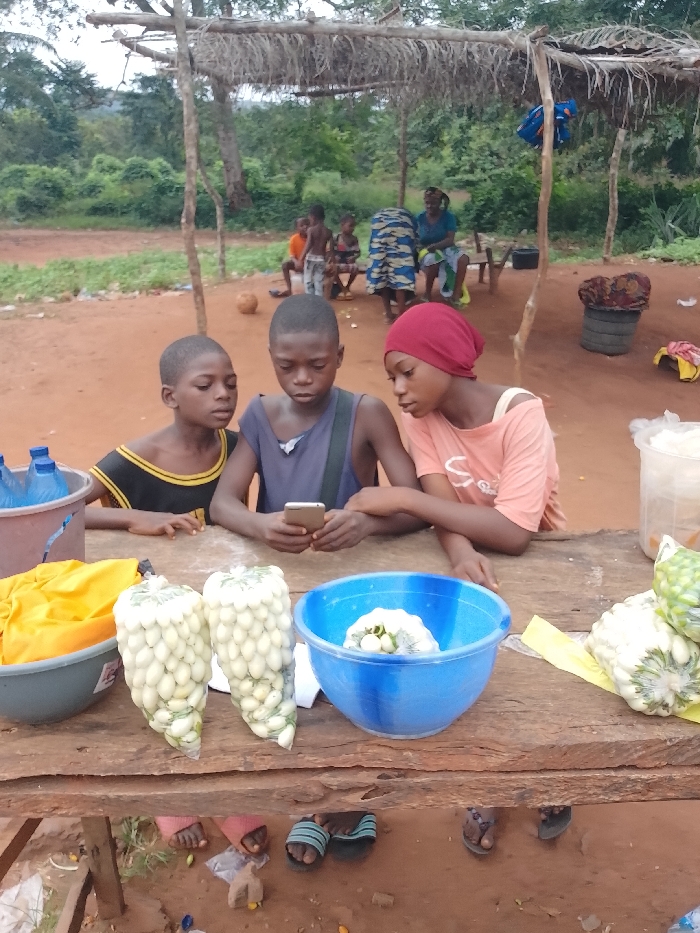 Three children huddle around a wooden table outdoors. A boy in a blue shirt holds a smartphone. Two other children, one in a yellow-trimmed black shirt and another wearing a red headscarf and peach shirt, peer at the device. On the table are two bags of white fruit, a blue bowl, and various containers. Behind them, other people sit beneath a thatched roof structure, and a landscape of trees is visible.