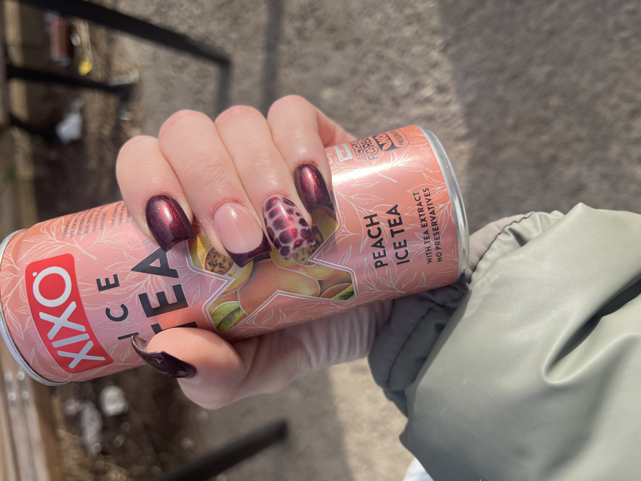 A human hand holds a Xixo Peach Ice Tea can in an outdoor setting in Bogomilovo, Bulgaria. The can is primarily peach-colored with red "XIXO" branding, "ICE TEA" in black lettering, and "PEACH ICE TEA" prominently displayed, along with "WITH TEA EXTRACT NO PRESERVATIVES" and a "RECYCLE ME" emblem. The person's fingernails are manicured; the thumb, index, and pinky fingers are painted a metallic dark red/burgundy. The middle finger features a French manicure style with a light base and a dark red tip, while the ring finger has a dark red base with a lighter, possibly iridescent, leopard-print pattern. A light olive-green puffy jacket sleeve is visible in the lower-left foreground. The ground surface appears to be grey concrete or asphalt, with blurred dark structures, possibly furniture legs, and faint debris in the background under direct sunlight.