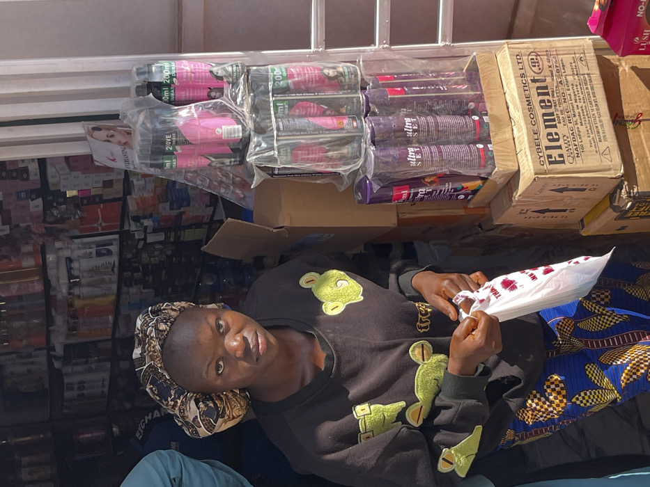 The image captures a street-side cosmetics shop in Jos, Nigeria, under bright daylight conditions