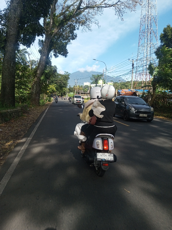 - "A daytime image captures a view from behind two individuals on a white scooter, driving on an asphalt road under a bright blue sky with scattered white clouds" by FM-5Z6bi2, licensed under CC BY 4.0