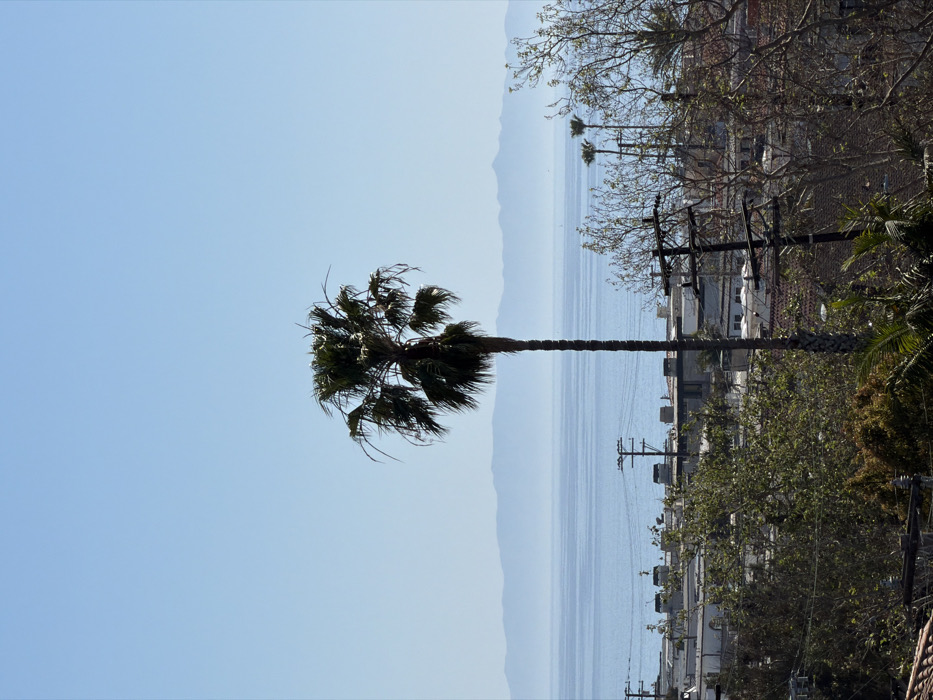 The image displays an elevated, panoramic view of Manhattan Beach, United States of America, looking westward over a coastal urban area towards the Pacific Ocean. A singular, tall palm tree with a dark trunk and green fronds dominates the central vertical axis, extending from the lower middle to the upper portion of the frame. The upper third of the image is a clear, light blue sky. Below the sky, the calm, blue surface of the Pacific Ocean is visible, with a distant, hazy mountain range forming a light blue horizon line. The mid-ground reveals a dense arrangement of low-rise buildings with varied roofing structures. A network of utility poles and overhead power lines is prominent throughout the mid-ground, intersecting the urban landscape. The immediate foreground consists of diverse vegetation, including the tops of deciduous and evergreen trees, and a portion of a terracotta-tiled roof in the lower left. No human figures or discernible actions are present within the scene. Several smaller palm trees are visible further in the mid-ground, near the coastline.