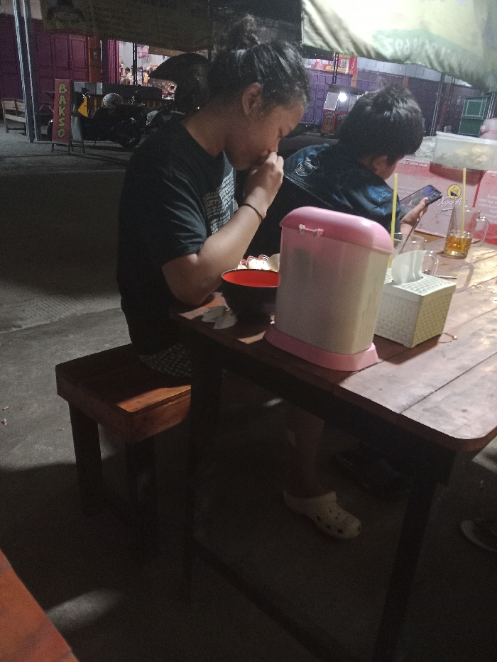 This image depicts a nighttime scene at an outdoor or semi-outdoor street food stall in Ketapang, Indonesia. Two individuals are seated at a rustic wooden table. The person in the foreground, with dark hair tied up, wears a dark t-shirt and checkered shorts, and is seated on a wooden bench. This individual is leaning forward, with their right hand near their mouth, appearing to consume food from a black bowl with a red interior rim. Crumpled white napkins are near the bowl. Opposite them, a second individual, viewed from behind, wears a dark patterned jacket and is engrossed with a smartphone. A light-colored clog shoe is visible on the floor beneath the table. On the wooden table, alongside the bowl, are a pink and white plastic container, a light green patterned tissue box, and a glass with a yellow straw containing a beverage. In the background, a white sign prominently displays "BAKSO" in red lettering, indicative of a food establishment. Several motorcycles are parked in the dimly lit background, in front of buildings with dark, possibly purple, roll-up doors. An overhead awning or tarp provides shelter for the eating area, illuminated by artificial light sources.