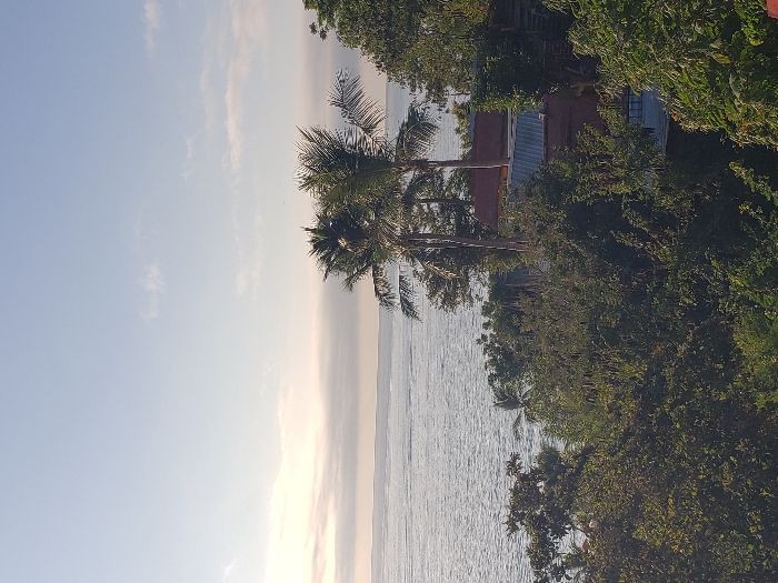 The image depicts an elevated view of a coastal landscape in Unknown, Mexico. The upper two-thirds of the frame consist of a light blue sky with scattered wispy white clouds and a hazy, light-colored band near the horizon. Below the horizon, a calm body of water, likely an ocean, spans the middle of the image, appearing grey-blue with subtle surface reflections. The foreground and lower mid-ground are densely covered with dark green tropical vegetation. Two prominent palm trees with green fronds are visible, rising above other foliage in the mid-ground. Partially visible within the dense greenery are elements of human construction: a structure with a reddish-brown wall and a silver-colored corrugated metal roof, and glimpses of a light-colored wall from another building. No individuals, discernible actions, or interactions are present in the scene. The lighting suggests either early morning or late afternoon.