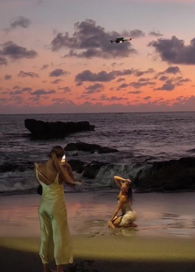 The video captures a beach scene at dusk. Two women are visible: one standing and holding a smartphone, apparently taking a photo of the other kneeling in the shallow water near the shore. A drone hovers in the air above them. The sky is filled with orange, pink and purple clouds, indicating sunset. The ocean stretches to the horizon with some rocky formations jutting out of the water near the shore. Waves gently crash on the sand. A light source, likely from the phone or an external lamp, illuminates the kneeling woman.