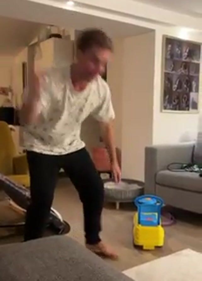 man in a living room explaining how he is going to perform a '20:20' roll. He then demonstrates the roll, but falls over a coffee table, knocking over a wine decanter and a glass of water. The television in the background is showing 'Black Rabbit' on Netflix. The man is barefoot and wearing black pants and a white patterned t-shirt. There is a toy truck on the floor, a dog bed, a yellow armchair, and a grey sofa. The coffee table also has a baguette and a plate of food.