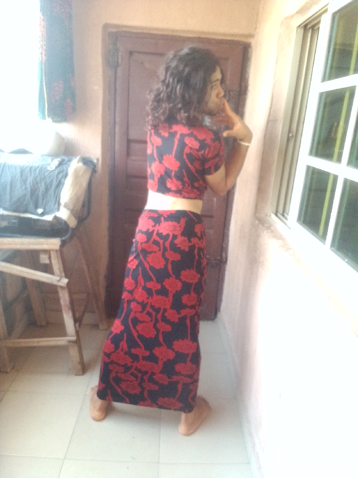 An individual with dark, curly hair, wearing a black two-piece outfit with red floral patterns (crop top and long skirt), stands barefoot on a light-tiled floor