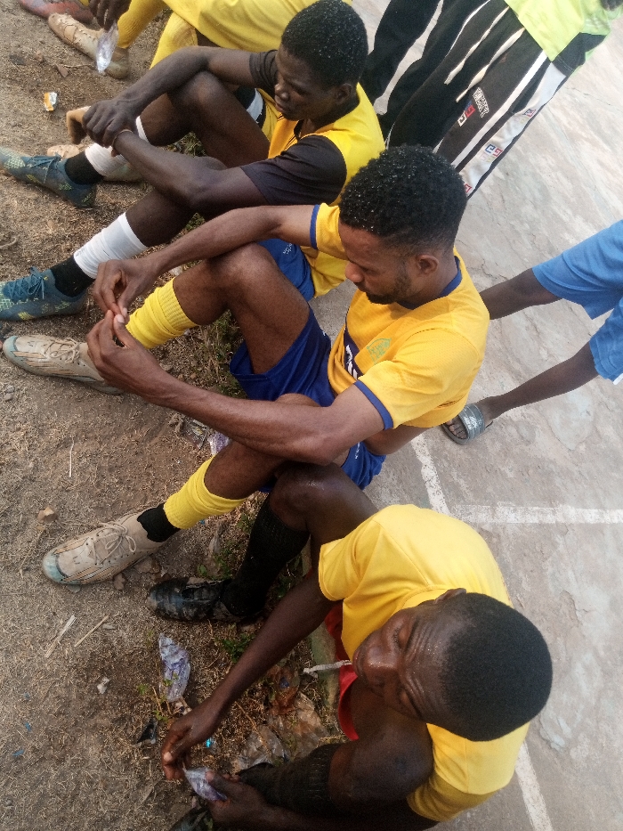 The image displays four dark-skinned adult males seated on the ground outdoors in Akwanga, Nigeria. The ground surface consists of dirt with scattered plastic debris and small organic matter on the left, transitioning to a light-colored paved or concrete surface with faint white markings on the right. From top-left, a male wearing a black and yellow short-sleeved athletic shirt, black shorts, white socks, and blue-green athletic shoes sits with his arms crossed over his chest, looking downwards. Adjacent to him, in the center, a male wearing a yellow short-sleeved athletic shirt with blue trim, blue shorts, yellow socks, and light-colored athletic shoes is actively adjusting material around his left ankle/shin with both hands. He has short, curly black hair and a short beard. To the bottom-right, a male in a yellow short-sleeved athletic shirt and red shorts leans forward, looking down at his hands, which are interacting with wet ground and debris. His face appears to be sweaty. A fourth male is partially visible on the far right, wearing a blue shirt and silver slide sandals on his right foot. No direct interactions between individuals are observed.