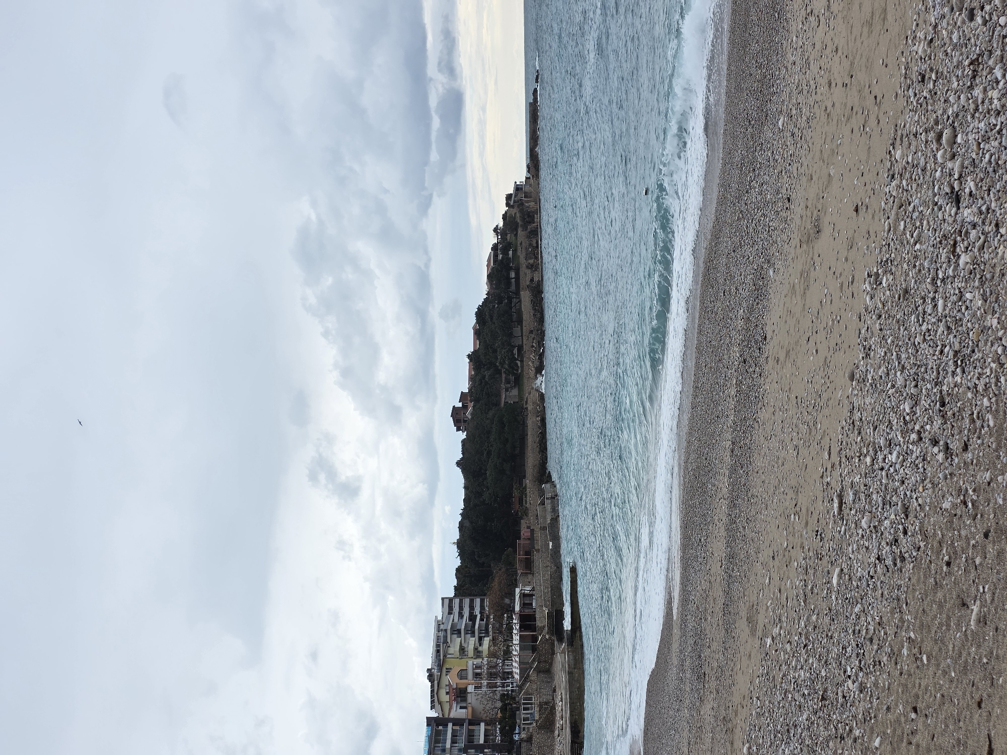 The image displays a coastal scene in Dobra Voda, Montenegro, under an overcast sky. The foreground consists of a pebble and sand beach, with waves from the turquoise-blue sea breaking softly along the shoreline. No individuals are present on the beach. In the midground, the sea extends towards the horizon, where a small, light-colored object floats on the water. To the left, a built-up area features multiple multi-story residential or hotel buildings with balconies, colored in shades of white, yellow, and blue, situated on elevated land near the coast. Below these structures, retaining walls and concrete platforms or small jetties are visible at the water's edge. To the right of the developed area, a natural rocky headland covered with dense green trees and shrubs extends into the sea. Several buildings with reddish roofs are sparsely visible atop this tree-covered terrain. Concrete structures also line the base of this headland at the waterline. A single dark bird is captured in flight in the upper center of the frame against the grey cloud cover.