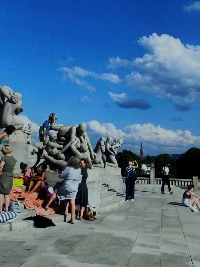 The image depicts a sunny outdoor scene at Vigeland Sculpture Park within Frogner Park, Oslo, Norway