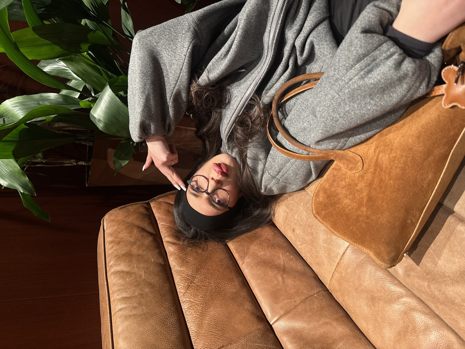A woman wearing glasses and a headband lies on a brown leather couch, her head tilted to the left. She points to her head with her left index finger. She is wearing a gray zip-up jacket, and a brown suede purse rests on her shoulder and the couch. A large potted plant stands behind the couch to the left. The scene is lit by a warm light.