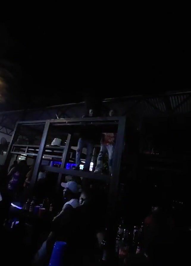 The video depicts a dimly lit scene inside a venue, likely a bar or club, where a small group of people are gathered. Two individuals stand on an elevated wooden platform with shelves, leaning over the edge. People are also visible in the foreground, some sitting at tables with bottles and cups. Blue lighting is present, adding to the club-like ambiance. The room appears to be crowded and lively, suggesting a social gathering or event.