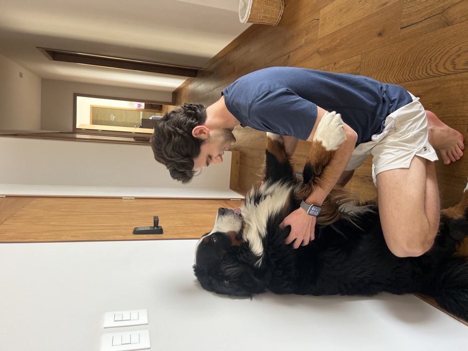 This image captures an indoor scene in Santiago Yancuitlalpan, Mexico, featuring a young adult male interacting with a Bernese Mountain Dog
