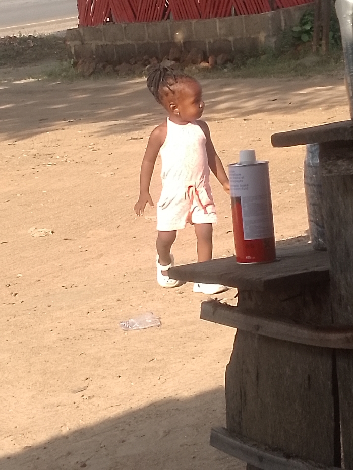 In Adankolo, Nigeria, a young child with dark braided hair stands outdoors on light brown, sandy ground. The child wears a light-colored, sleeveless romper with a waist tie and white closed-toe shoes, facing slightly right and looking off-frame. To the child's right, a red and white cylindrical can with a white cap rests on a dark, rustic wooden structure. A crumpled clear plastic bottle is visible on the ground to the child's left. In the background, a paved road is present on the left, with a low dark wall featuring reddish vertical elements and green foliage beyond it. The scene is illuminated by bright daylight, casting distinct shadows.