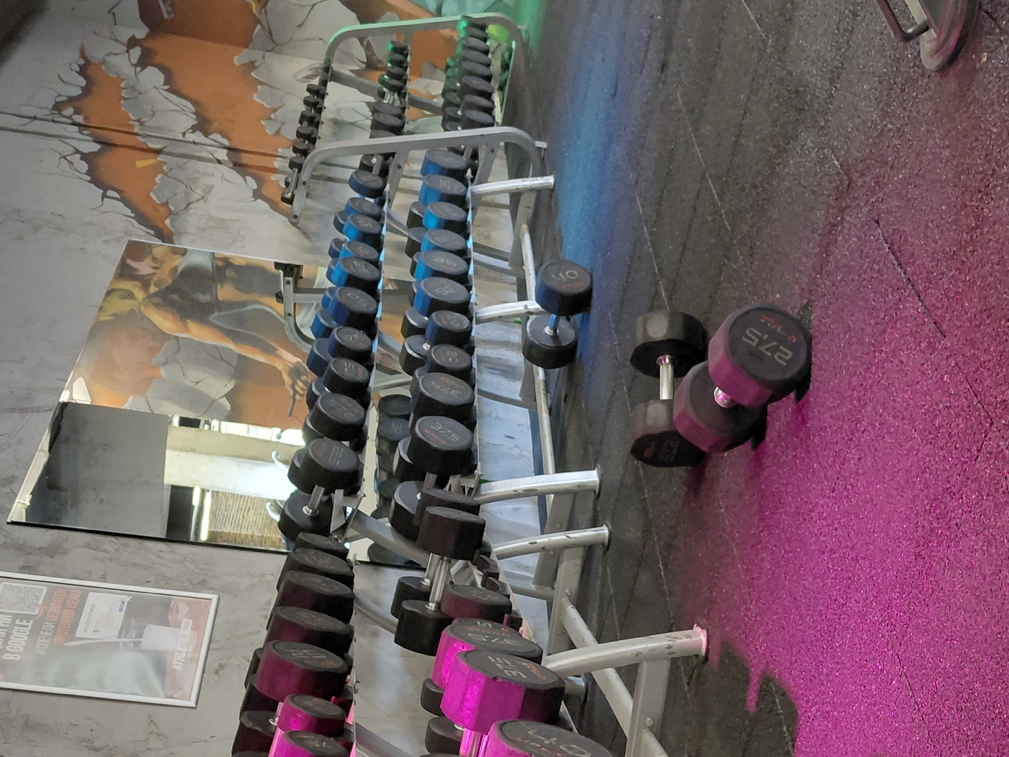 The image depicts a weight rack in a gym, presumably in Sofia, Bulgaria, as indicated by the Bulgarian text in a framed advertisement visible in the lower left corner of the image. The focus is on a weight rack stocked with dumbbells of varying weights. The dumbbells range from black to blue to pink, with their weights printed on the sides. Some of the dumbbells are arranged neatly on the rack, while others appear to have fallen off onto the floor, notably a pair of black dumbbells labeled "27.5." To the right, the flooring transitions from a gray to a magenta-colored surface. The background is somewhat blurred. A mirror is reflecting a distorted image of the rack and the surrounding area. The walls are decorated with a painted, abstract design.