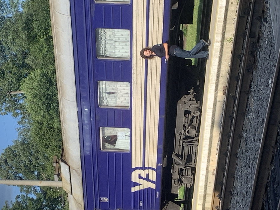 The scene depicts a train station in Yasinia, Ukraine, under clear daylight conditions. A dark blue and beige passenger train car, bearing the white "УЗ" (Ukrzaliznytsia) logo and a Ukrainian trident emblem, occupies the upper half of the frame. Three windows are visible on the train car, each fitted with white, patterned curtains. The leftmost window displays a dark, possibly reddish object behind the curtain and a white paper sign marked with the number "2." The train's metal bogie is visible beneath the car. On the concrete train platform adjacent to the train, an individual with shoulder-length curly brown hair is walking from left to right. The person is wearing a dark, short-sleeved collared shirt with a circular emblem on the left chest and blue jeans. A small, light-colored object is held in their left hand. The individual's gaze is directed towards the right side of the frame. Below the platform, multiple railway tracks are visible, consisting of metal rails laid on gravel ballast. In the background, beyond the train and platform, dense green foliage and a clear blue sky are present. A tall, dark pole is partially visible on the far left, extending upwards.