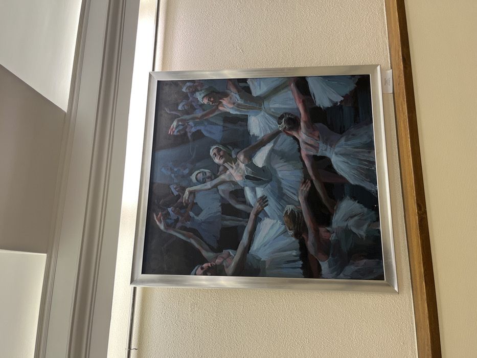 A large, rectangular oil painting, encased in a simple silver-toned metal frame, is displayed prominently on a textured, light beige wall. The artwork depicts a dynamic scene featuring multiple female ballet dancers, clad in white or light blue tutus and leotards, performing various poses. Approximately ten figures are discernible, with more implied in the background. A strong, central beam of light illuminates the primary dancers against a dark, undefined backdrop, creating a dramatic effect. One prominent dancer, positioned slightly left of center, gazes upwards with both arms extended gracefully. Another dancer, in the lower right foreground, is depicted from behind, arms outstretched. Above the painting, a multi-tiered white crown molding with integrated linear LED lighting runs horizontally along the ceiling, illuminating the wall surface. Below the painting, a dark brown wooden handrail or ledge is affixed to the wall. A small, unreadable white plaque is present on the wall below the bottom right corner of the frame, partially resting on the wooden ledge. The setting is an interior public or semi-public space, indicative of an art gallery, theater lobby, or cultural institution, located within the city of Krasnodar, Russia. The specific name or address of the building is not identifiable from the image.