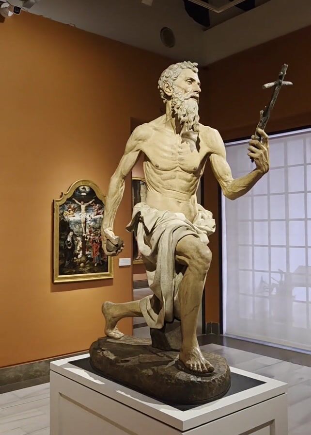 statue of a man holding a cross in a museum. The statue is of a bearded, muscular man, kneeling on a rocky base. He is partially draped in a white cloth and holds a cross in his right hand. The museum walls are painted a warm orange color. Behind the statue, there are paintings on the wall and a doorway leading to another room. The room is lit by spotlights on the ceiling. The statue is on a white pedestal, and the floor is made of light gray stone tiles.