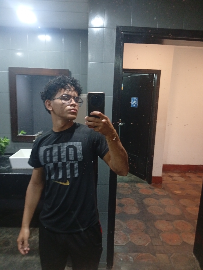 A young male is depicted in a mirror selfie taken within a restroom in Playa El Agua, Venezuela
