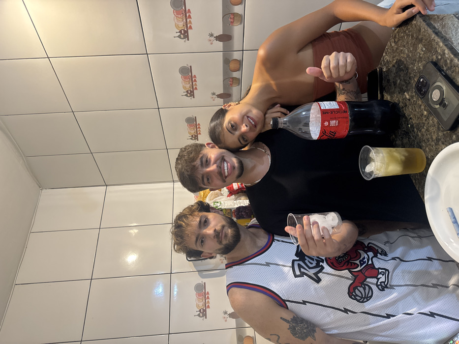 Three young adults pose closely together. One wears a white basketball jersey with a cartoon character on it. Another is wearing a black t-shirt and has a woman leaning onto their shoulder. She wears a brown top and gives a thumbs up. A bottle of Coca-Cola, two plastic cups, a cell phone, and a plate are on the counter. The background is a tiled wall.