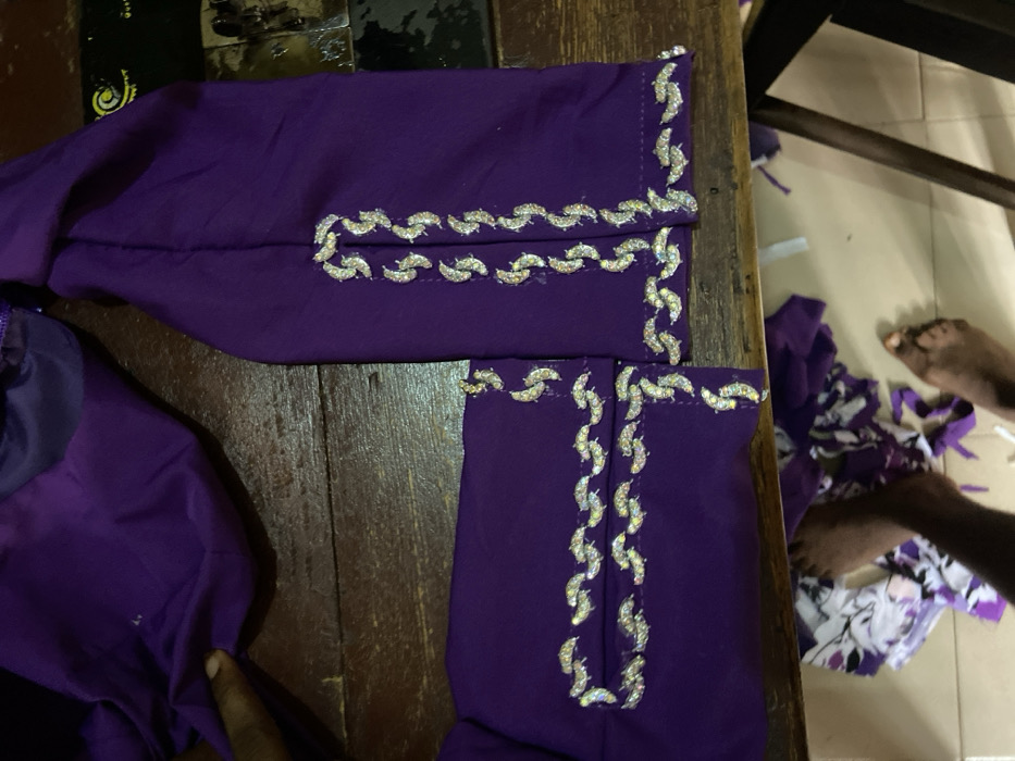 A section of a purple garment adorned with a decorative silver trim that resembles linked pairs of small crescents is laid on a wooden surface. The trim outlines the edges of the garment's sleeves. To the right, fabric scraps in purple and white are visible on a tiled floor. A sewing machine is partially seen at the top left. Part of a leg and foot are also visible, near the fabric scraps.