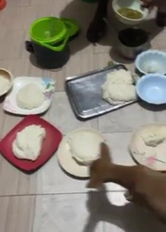A video shows a person squatting on a tiled floor and portioning out what appears to be a stew from a bowl onto various plates. Each plate already has a portion of white food on it. Surrounding the person are several pots, buckets, and food containers. A light brown dog is sniffing around the plates. Another person is partially visible in the frame to the right, seated. The room has bare concrete walls.