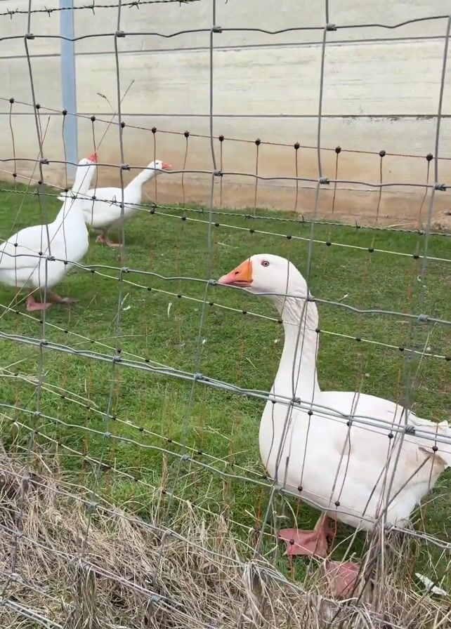 Three white geese are in a grassy, fenced-in area. One goose is standing at the foreground fence, looking towards the camera. Two other geese are in the background, moving along the grass. The fence is wire, and some dry, dead grass is in the foreground near the fence. A concrete building is visible beyond the fence in the background. The geese are making loud honking sounds.
