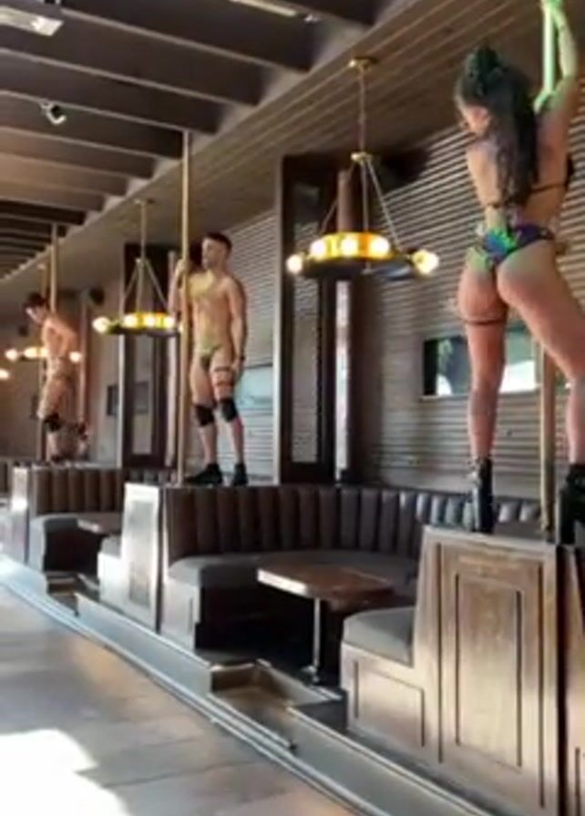 Three people, two men and one woman, are performing on poles that are placed on top of dining booths. The two men are in the background, while the woman is in the foreground, closest to the camera. All three are scantily clad and wearing athletic knee pads. The environment appears to be an upscale outdoor dining area, with booths, tables, and overhead chandeliers. The music is upbeat.