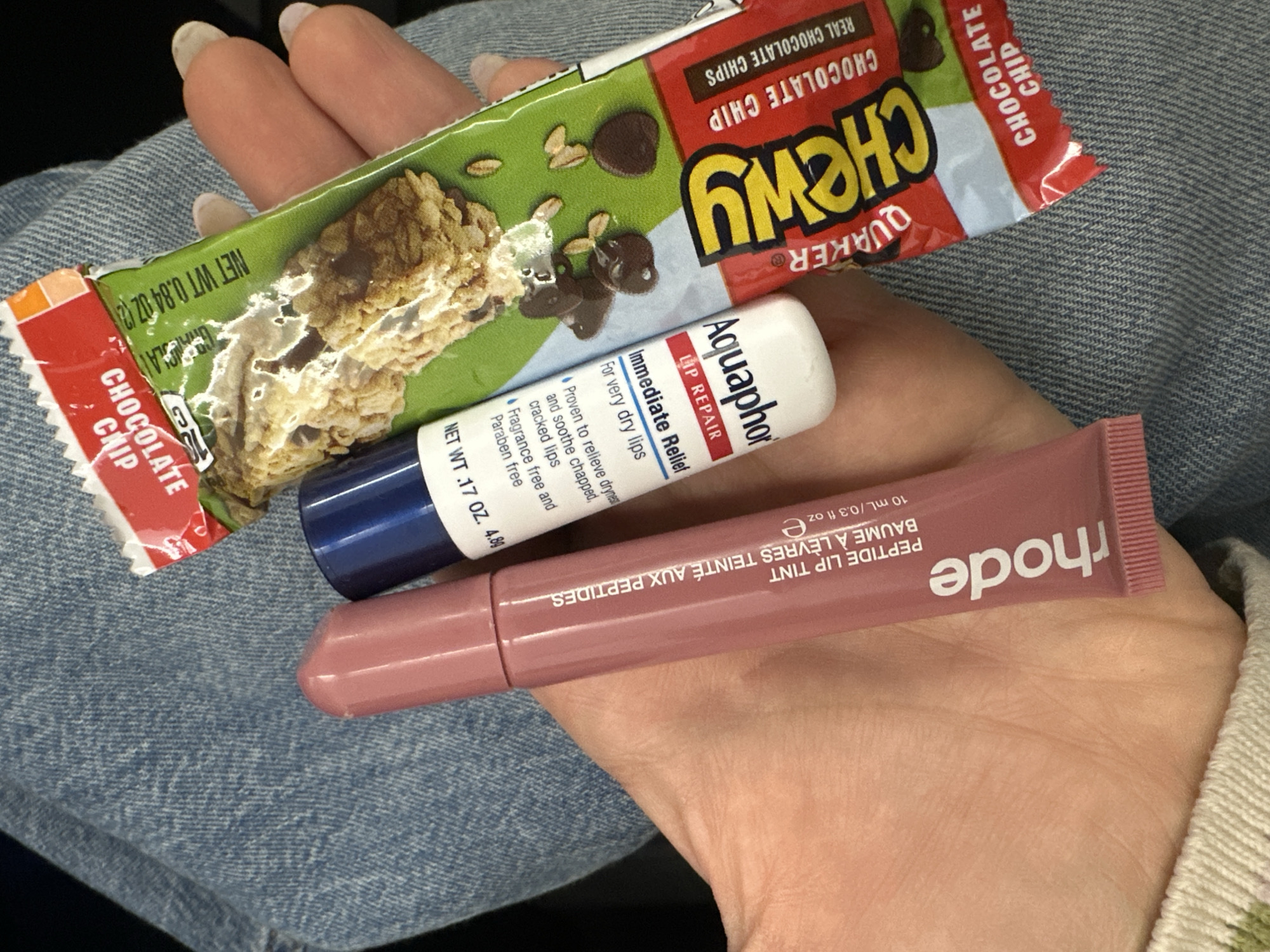 A hand holds a Quaker Chewy chocolate chip granola bar, an Aquaphor lip repair tube, and a Rhode peptide lip tint tube