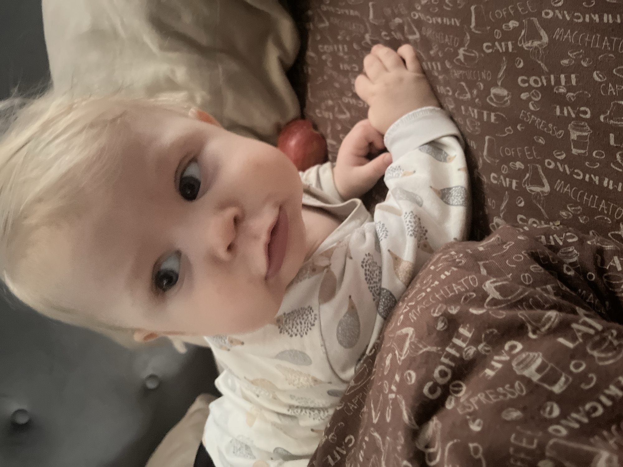 A fair-skinned child with light blonde hair is positioned on its stomach in an indoor setting in Vesyoloye, Russia. The child, wearing a light-colored long-sleeved garment patterned with grey and light brown hedgehog-like figures, looks towards the left with wide, dark eyes. Its mouth is slightly open. The child's left hand rests on a brown fabric surface decorated with white text and illustrations related to coffee, including words like "COFFEE," "ESPRESSO," and "LATTE." A red apple is partially visible on this brown patterned surface to the child's right. In the background, a dark grey cushioned headboard with two circular indentations is visible on the left, while a light-colored, possibly beige, pillow or blanket is present on the right.