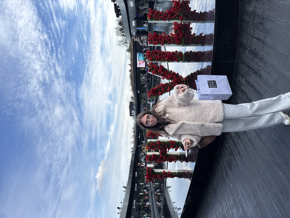 A young adult female is depicted standing in an outdoor commercial setting, identified as The Village outlet shopping center in Villefontaine, France. She has long, dark brown hair and wears light-colored eyeglasses. Her attire consists of a cream-colored, textured fleece jacket, light grey wide-leg trousers, and white sneakers with dark detailing. In her left hand, she holds a white smartphone, and in her right hand, she carries a light blue shopping bag labeled "RITUALS...". A brown shoulder bag is visible on her left hip. She is positioned in front of a large, dark, reflective water feature containing three-dimensional letters constructed from red roses, spelling "THE VILLAGE". The letters "THE VILL" are clearly visible, with the rest extending beyond the right frame edge. The background features several modern, dark-colored commercial buildings with flat, landscaped roofs, housing various retail establishments, including partial signage for "ADIDAS," "NIKE," and "HARIBO." Indistinct pedestrian figures are visible throughout the background. Bare trees stand behind the buildings, suggesting a cold season. The sky is partly cloudy with areas of visible blue. The ground in the foreground is dark-colored plank flooring.