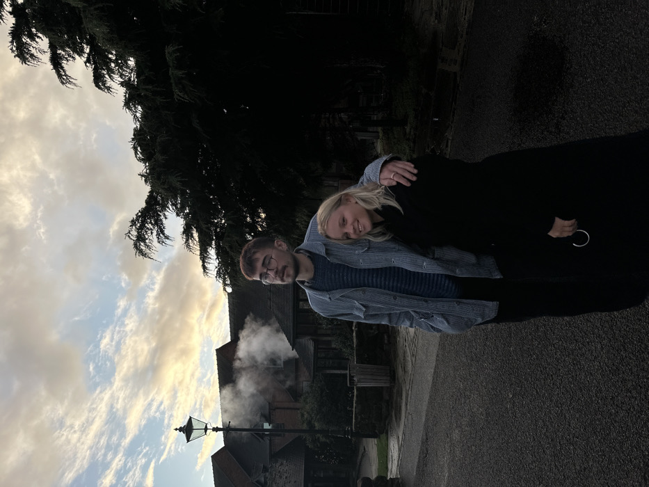 Two individuals, one male and one female, are standing on an asphalt road in Kinver, South Staffordshire, United Kingdom, at what appears to be dusk. The male, positioned to the left, has reddish-brown hair, glasses, and a short beard. He is wearing a light blue and white striped jacket over a darker striped top and dark trousers. His right arm is around the female's left shoulder, and he is looking slightly upwards and to his left. The female, positioned to the right, has blonde hair and is wearing a dark, long-sleeved garment. She is smiling and looking directly at the viewer, holding a silver hoop in her left hand. In the background to the left, a traditional black streetlamp stands in front of a red-brick building with dark tiled roofs, from which white smoke is emanating from a chimney. A dark, wooden-panelled litter bin is visible behind the male. To the right, large, dense coniferous trees are present. The sky above is overcast with scattered clouds displaying hues of pale blue, grey, and orange.