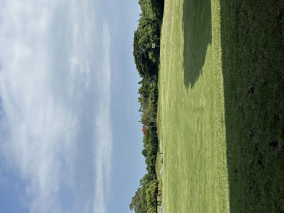 A serene landscape features a vibrant green field, likely a golf course, bordered by lush trees. A marker labeled "100" stands amidst the greenery, suggesting distance. The sky, a blend of light blues and soft clouds, occupies a significant portion of the frame, adding to the tranquil atmosphere. Shadows cast by the trees on the right imply the presence of sunlight and further enhance the depth of the scene.