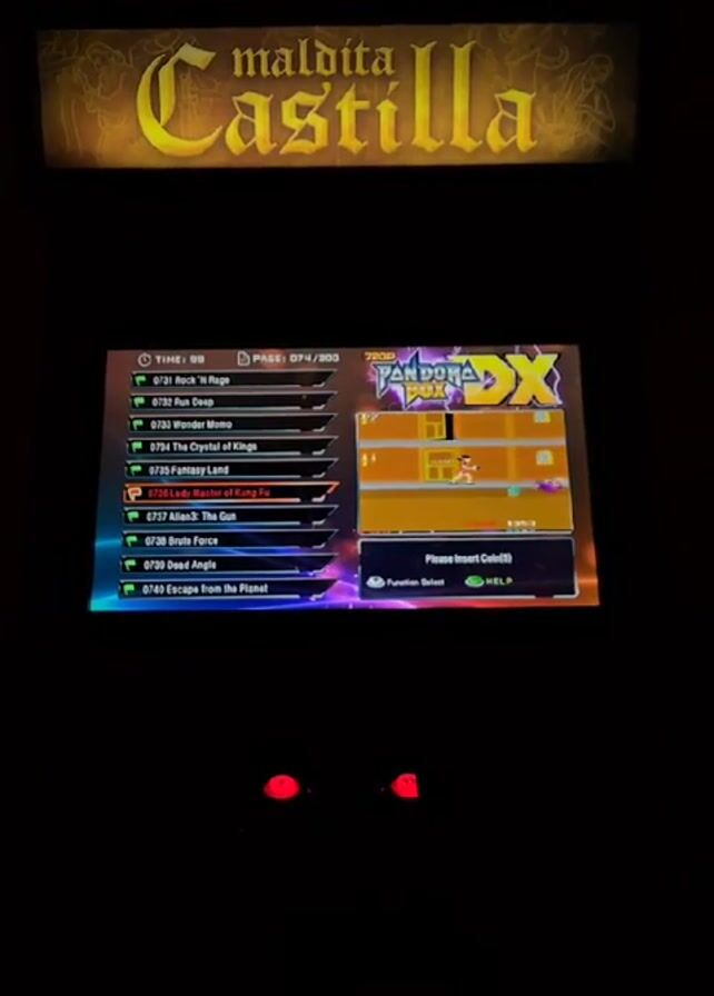 close-up of an arcade machine in a dark environment. The machine is displaying a menu of games on a Pandora Box DX system. The screen shows a list of games with corresponding numbers, including titles like "Rock 'N Rage," "Run Deep," "Wonder Momo," and "Lady Master of Kung Fu." A preview of one of the games is displayed on the right side of the screen, with a "Please Insert Coin(s)" message. Below the screen, two red buttons are visible. Above the screen, a sign with the words "Maldita Castilla" in a gothic font is illuminated. The audio includes background noise, but it is difficult to discern specific sounds beyond general chatter.