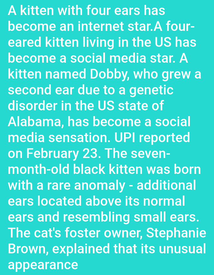 This image is a partial digital text document displayed against a solid turquoise background, featuring white sans-serif text. The content describes a news report about a seven-month-old black kitten named Dobby, residing in the US state of Alabama. This kitten has achieved internet and social media fame due to a genetic disorder that resulted in the growth of a second pair of ears located above its normal ears. UPI reported this information on February 23. The kitten's foster owner is identified as Stephanie Brown. The text is abruptly truncated at the bottom, indicating an incomplete excerpt. The specific city within Alabama where the kitten resides is not mentioned in the provided text.