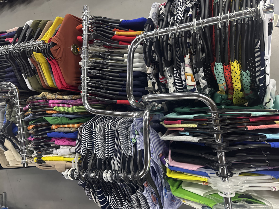 Two levels of chrome clothing racks are filled with colorful garments on black hangers
