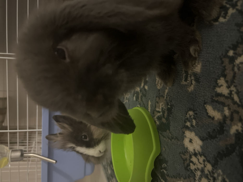 A gray rabbit peers curiously from inside its cage, near a water bottle. A larger, blurry gray rabbit looms above, nose nearly touching a vibrant green food bowl. The scene is indoors, with the cage visible on the left and a patterned blue rug in the background. The angle is slightly tilted, giving an up-close view of the rabbits.
