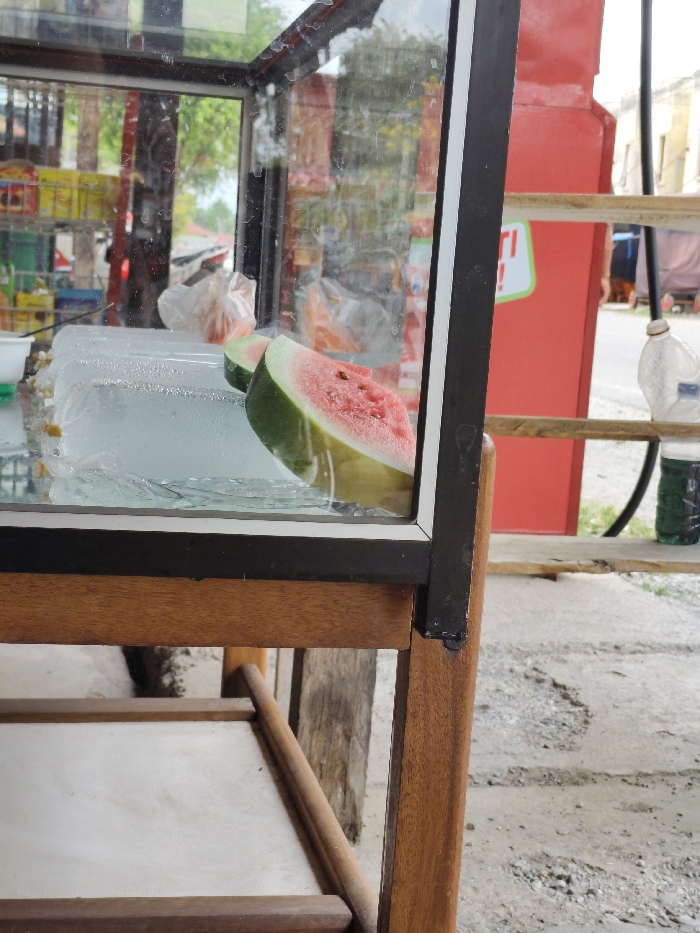 The scene presents a close-up view of a glass-fronted display case positioned outdoors in Jurong Pante, Indonesia. Inside the upper compartment, two slices of watermelon with red flesh and visible black seeds are displayed on a transparent surface. Behind these, multiple transparent plastic bags filled with a translucent, likely frozen or chilled substance (ice), exhibit condensation. The display case features black framing for its glass panels and rests on a light-brown wooden stand, revealing a lower wooden shelf. In the mid-ground, external to the display case, a prominent red structure, possibly a part of a vending unit or a roadside stall, is visible to the right, displaying a partial white and green sign. Adjacent to this, a clear plastic bottle and a green bottle rest on a horizontal wooden plank or shelf. The ground beneath consists of concrete and loose gravel. The background, blurred, shows trees and architectural elements consistent with an outdoor street or market setting. No individuals are visible.