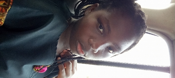 A young individual with dark skin and braided hair, wearing a dark garment, is depicted in a medium close-up, seated inside a vehicle